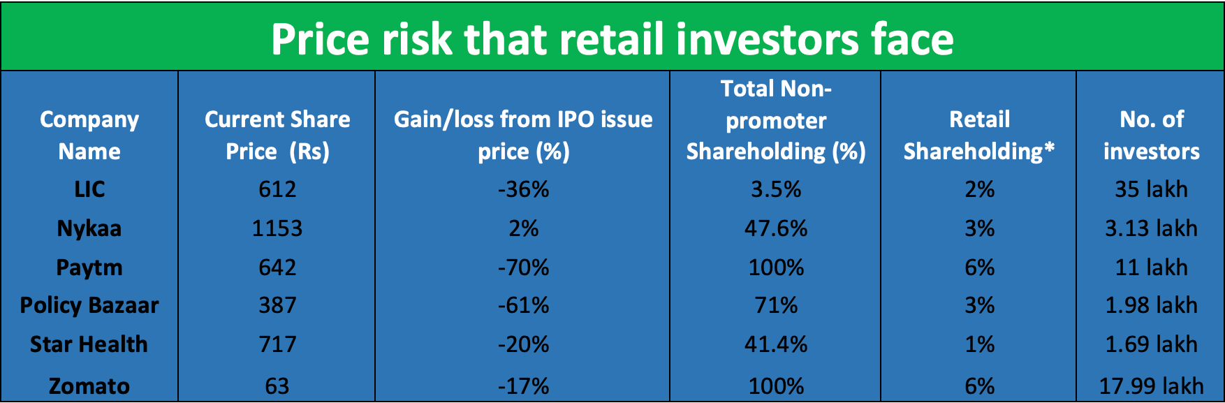 All the above IPOs were heralded by retail investors who jumped in, in lakhs. Today the shareholding pattern of LIC, for example, shows that retail investors have the largest piece of the pie other than the promoters. Unfortunately, the table also shows how returns have fallen since listing.