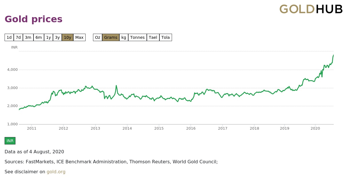 Hence, gold is not a reliable safe investmentAn investment is made to give you a return. You make an investment if you use your money to buy either physical assets like property or financial assets like bonds and equity with an aim to receive income or gains... More for the short term and in the long run, expect returns which trace inflationInflation is a common term thrown around in economics lessons and by politicians around election time. What it means in simple language is that prices of things you buy, stuff, keeps increasing every year. It happens because the economy in... More in the economy.
